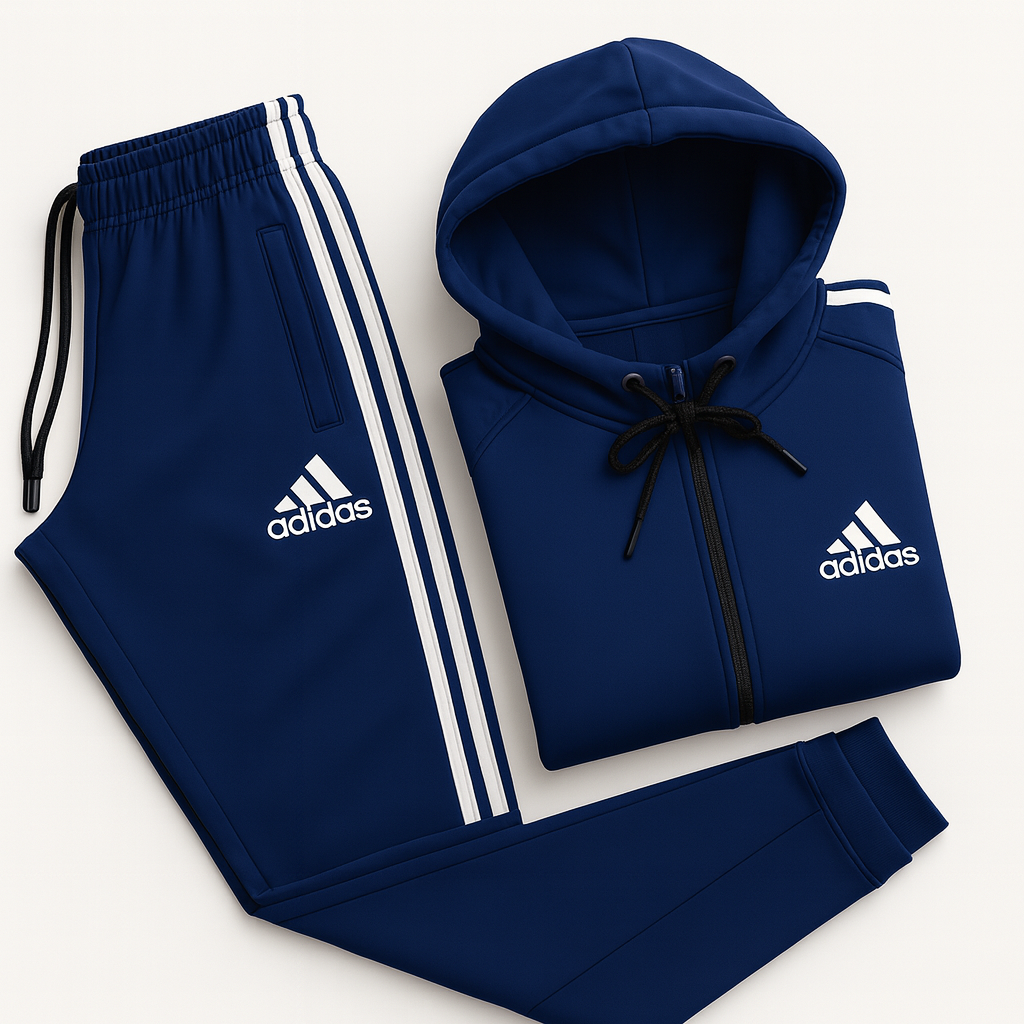 The Adidas Interlock Polyester Fleece Tracksuit Navy pairs classic sports heritage with modern comfort and versatile everyday wear. Designed in a deep navy blue shade with signature white Adidas-style triple stripes, this two-piece tracksuit delivers an iconic athletic look. Crafted from premium interlock polyester fleece, the fabric provides a smooth, durable exterior with a warm, brushed interior—perfect for cooler seasons, training, travel, or relaxed daily styling.