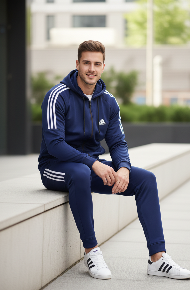 The full-zip hoodie features raglan sleeves for mobility, white triple stripes along the shoulders, a drawstring-adjustable hood, ribbed cuffs, and practical hand pockets. The white Adidas-style chest logo adds clean branding without overwhelming the sleek design. The matching joggers offer a tapered silhouette, elastic waistband, adjustable drawstrings, ribbed cuffs, and coordinating side stripes for a cohesive, athletic finish.
