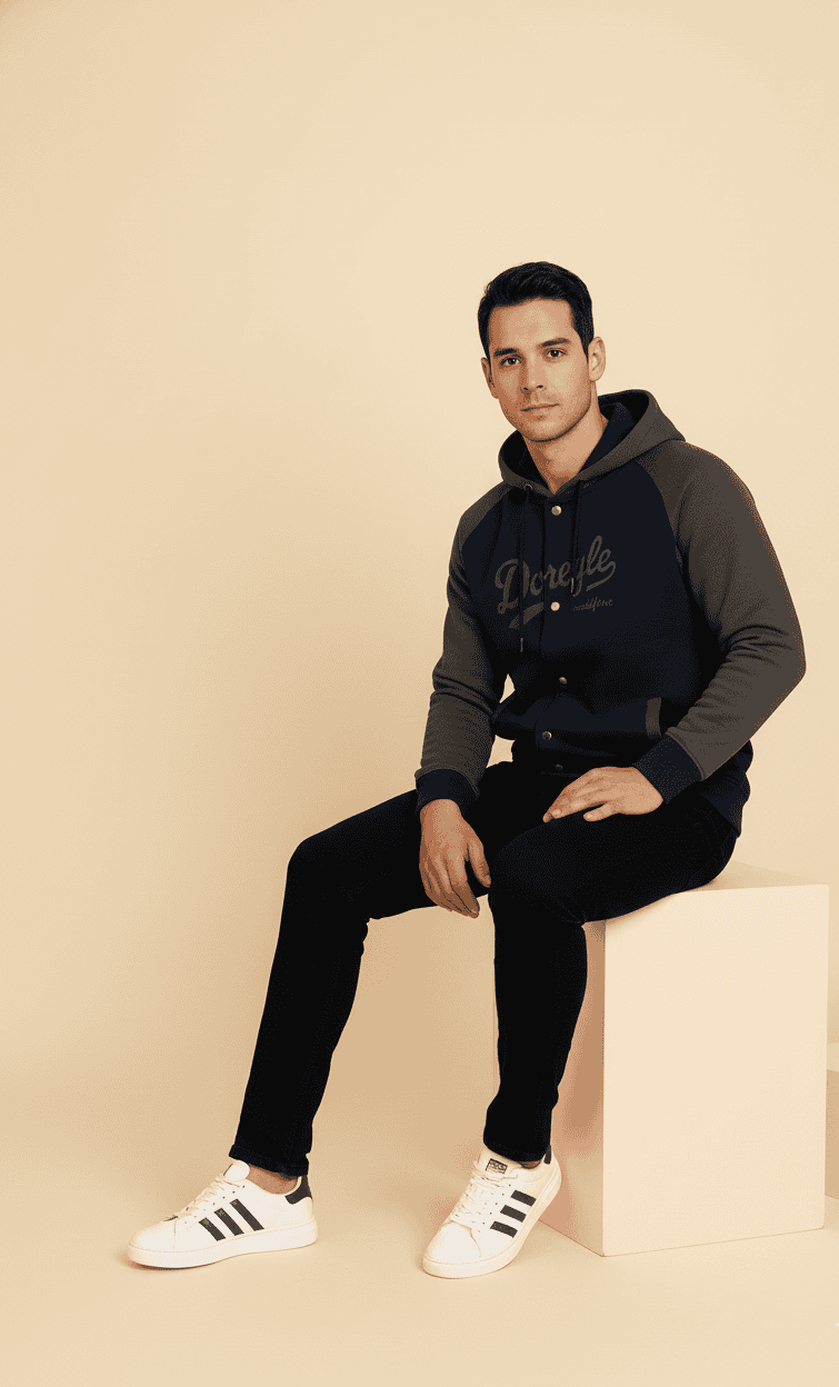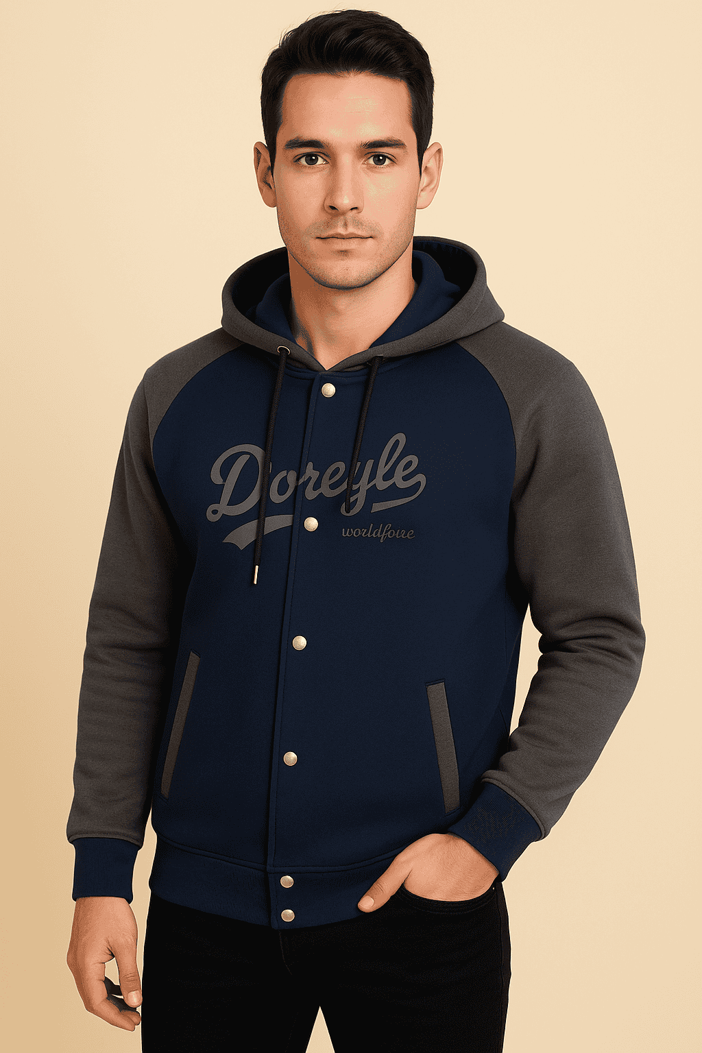 Embrace the ultimate blend of collegiate charm and contemporary streetwear with the Fleece Button-Front Hoodie. This premium piece redefines casual comfort with its distinctive color-block design and unique patch detailing. Crafted from a soft, heavyweight cotton blend, this hoodie features a unique navy blue and charcoal grey contrast, highlighted by a sporty snap-button closure. Functionality is key with handy side pockets accented by charcoal grey trim. Elevated with bold, layered graphic and text detailing on the chest and sleeves, the Fleece Hoodie is an essential statement piece for a relaxed, confident style.