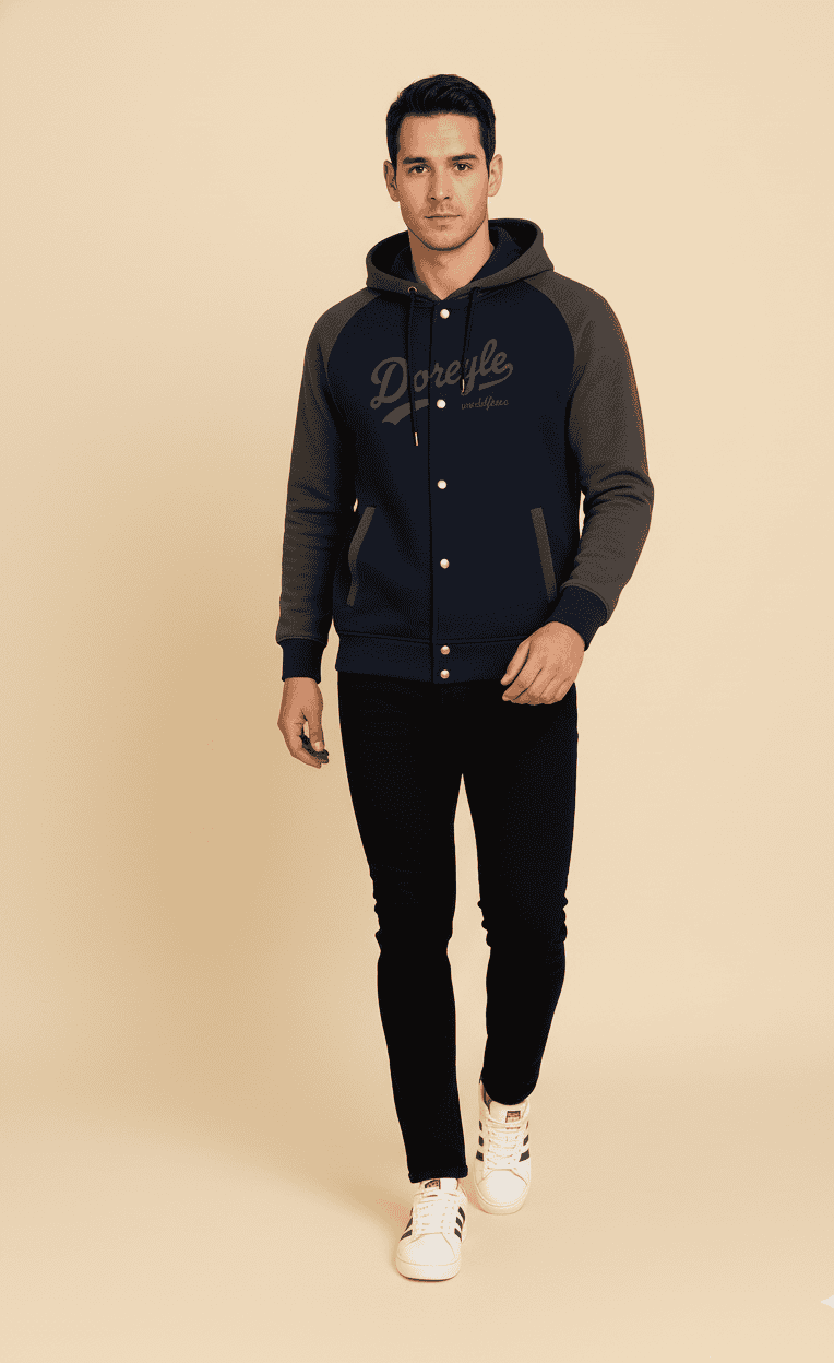 - Striking Color Block: The rich contrast between the navy blue body and charcoal grey sleeves/hood exterior creates an immediate, eye-catching aesthetic, reminiscent of classic varsity jackets.