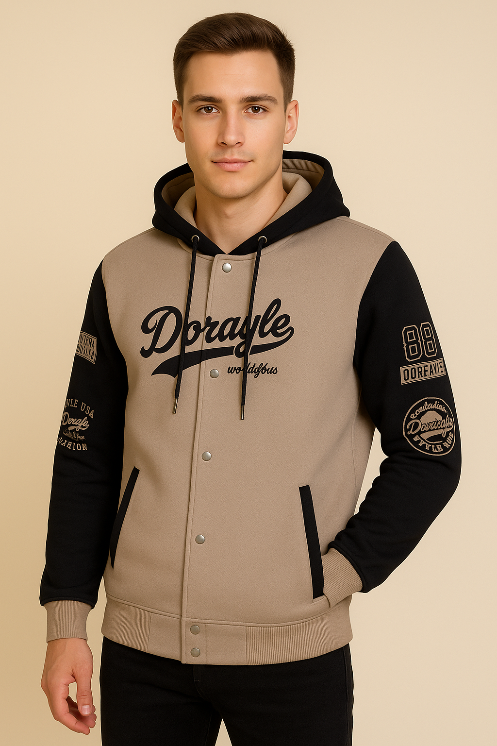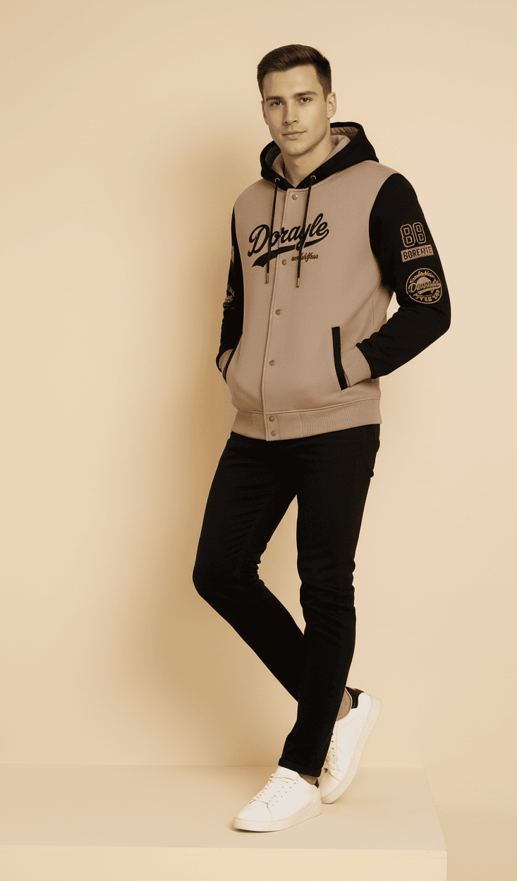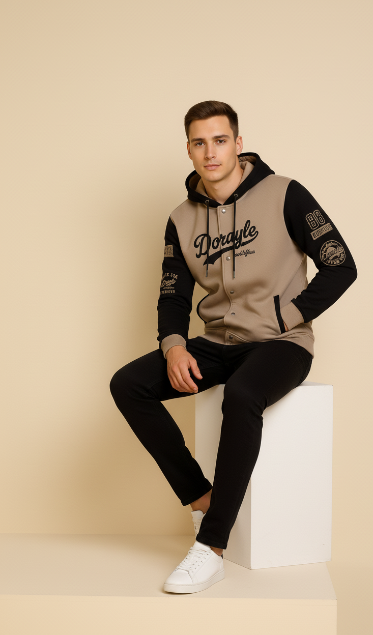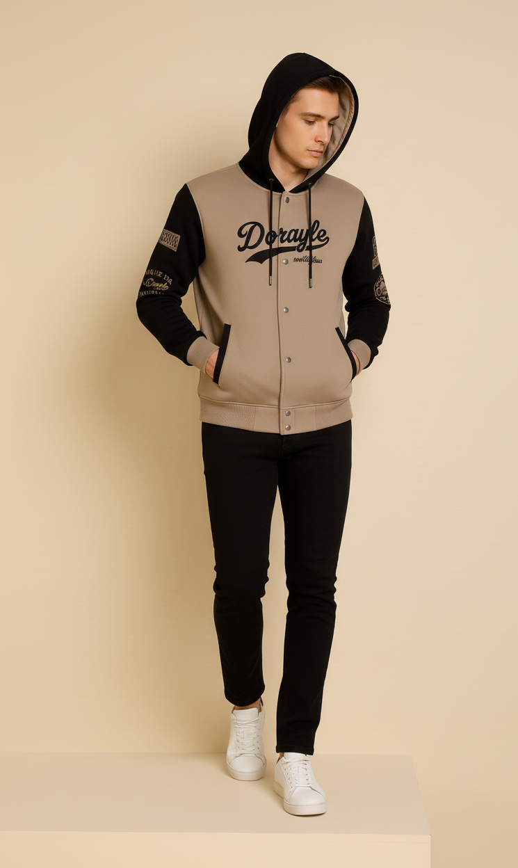 Embrace the ultimate blend of collegiate charm and contemporary streetwear with the Fleece Button-Front Hoodie. This premium piece redefines casual comfort with its distinctive color-block design and unique patch detailing. Crafted from a soft, heavyweight cotton blend, this hoodie features a unique black and beige/tan contrast, highlighted by a sporty snap-button closure. Functionality is key with handy side pockets accented by black trim. Elevated with bold, layered graphic and text detailing on the chest and sleeves, the Fleece Hoodie is an essential statement piece for a relaxed, confident style.