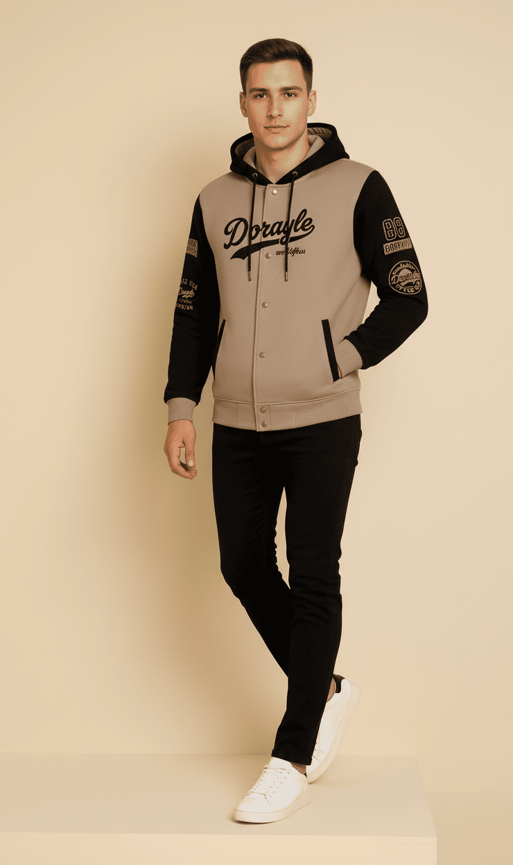 - Striking Color Block: The rich contrast between the light beige/tan body and black sleeves/hood exterior creates an immediate, eye-catching aesthetic, reminiscent of classic varsity jackets.
