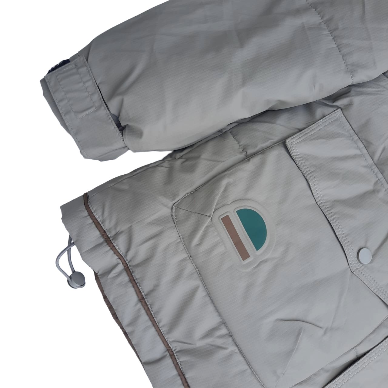 To support everyday functionality, the jacket includes two oversized front pockets secured with snap-button flaps. These pockets are ideal for keeping essentials close and protected. The adjustable internal drawstring hem allows you to tailor the fit, improving warmth retention and shaping the jacket to your preference. Meanwhile, the teal, brown, and rose accent patch on the left pocket adds a subtle, stylish graphic detail.