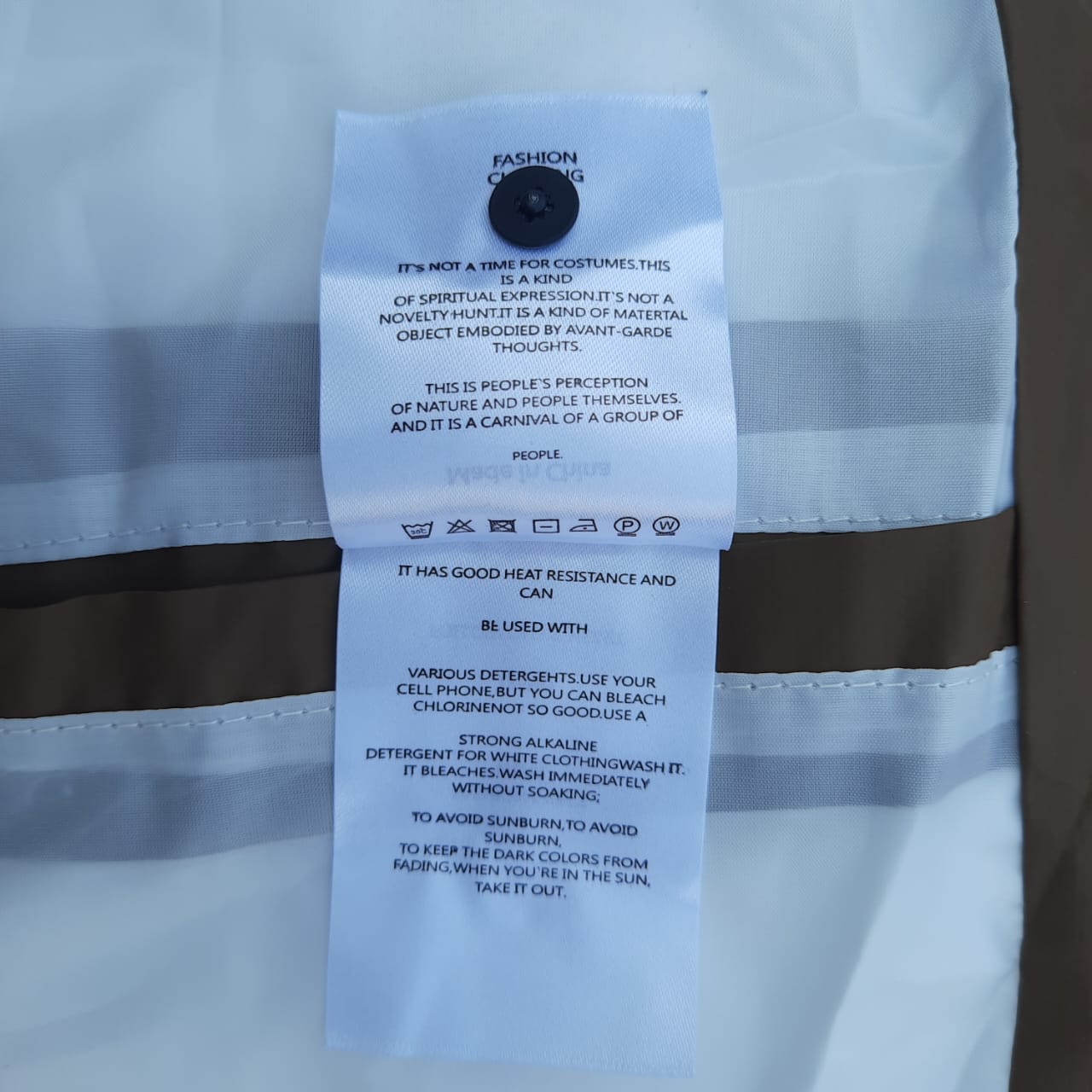 • Ironing: Do not iron; use a low-steam setting if needed