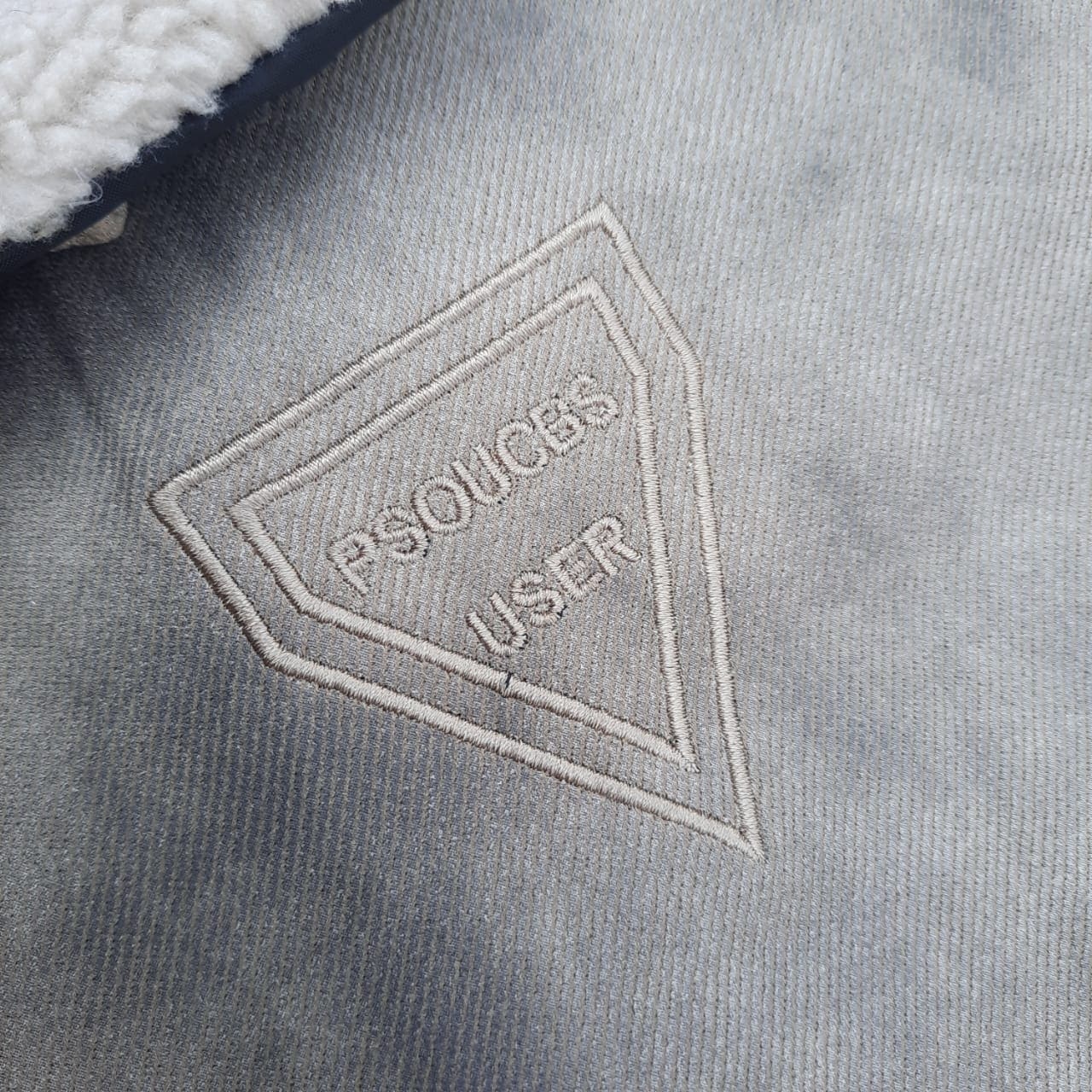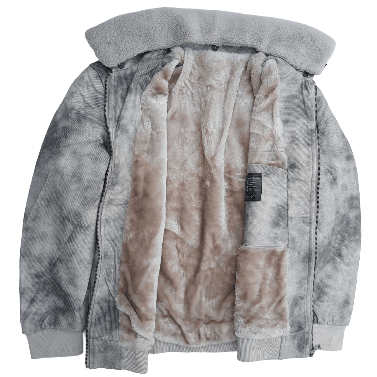 This version of the PSOUCBS User Die Colar Jacket features a Light Gray marbled shell with subtle tonal variations and a fine corduroy-like rib texture. Inside, a cozy Off-White faux-fur lining enhances warmth and softness, creating a high-contrast interior that feels premium and inviting. The large fold-down Sherpa collar, finished in the same Off-White tone, elevates the jacket’s winter aesthetic while offering added neck protection.
