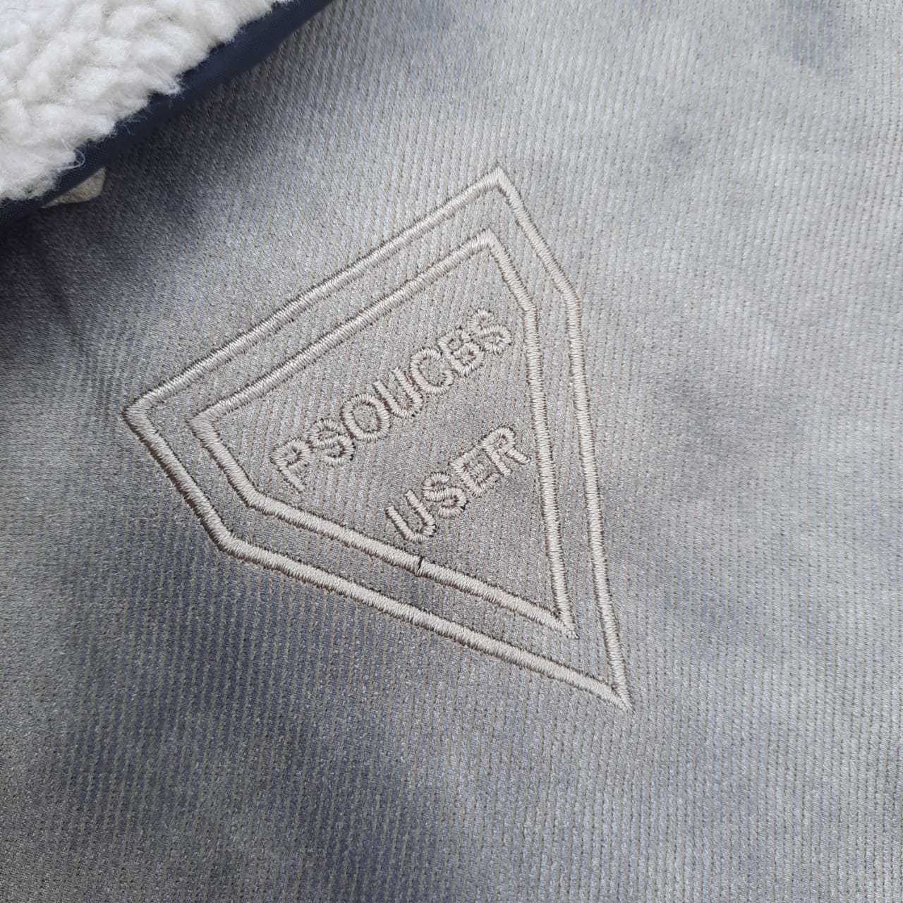 Two angled welt pockets provide space for your hands or essentials, making the jacket practical as well as stylish. The marbled gray shell has a tie-dye effect that adds character, while the plush interior gives a cozy feel during longer wear. The PSOUCBS chest print and small woven patch add a subtle streetwear touch without being overwhelming.