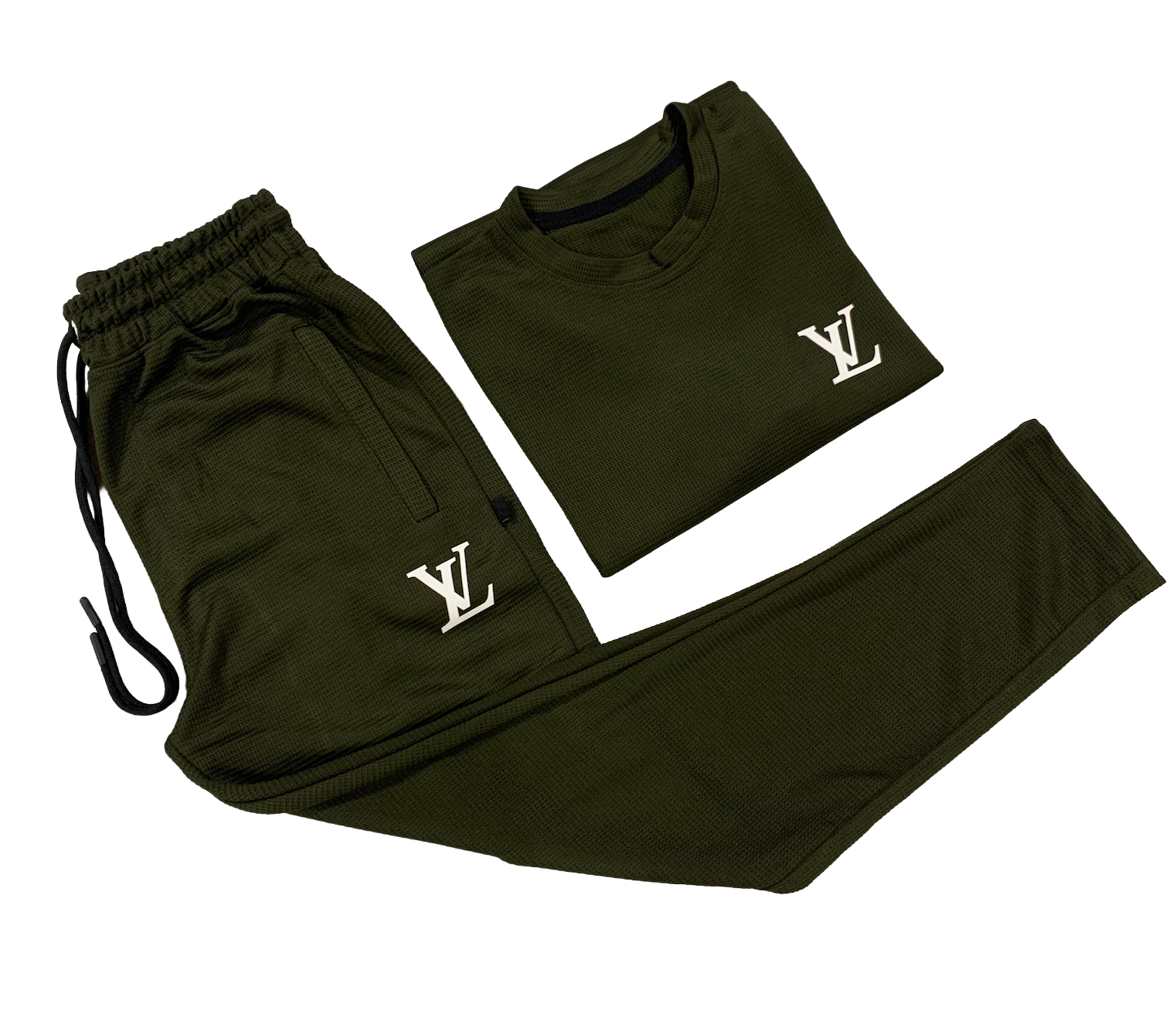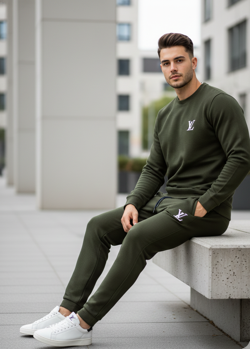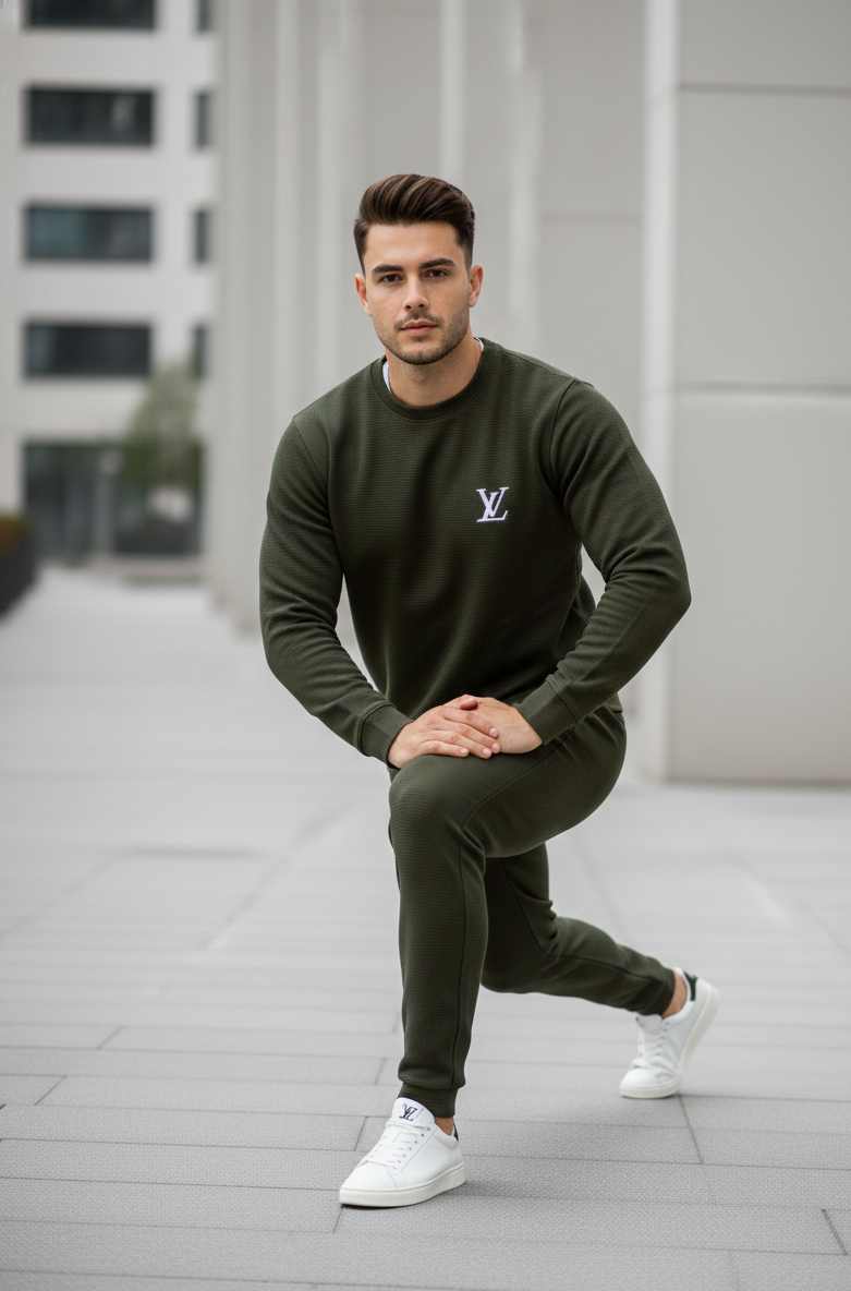 Embrace luxurious comfort and contemporary style with the LV Round Neck Check Tracksuit, the ultimate statement in high-end casual wear. Designed for the modern wardrobe, this two-piece set offers an authentic, relaxed fit, perfect for both lounging and sophisticated streetwear. Crafted from a premium heavyweight knit fabric, the tracksuit features a distinctive subtle waffle/checked texture in a rich, dark olive green color, ensuring superior warmth and a tactile finish. The iconic white “LV” logo is meticulously placed on the chest of the sweatshirt and the thigh of the pants, guaranteeing instant brand recognition and exclusivity. This SEO-optimized tracksuit combines effortless style, premium fabrication, and unparalleled comfort, making it a must-have addition to your winter collection.
