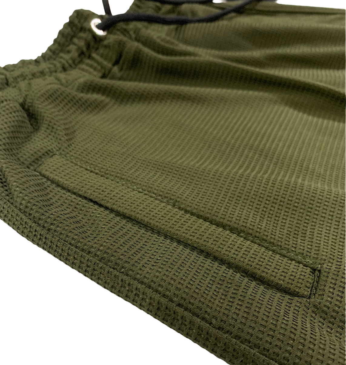 • Distinctive Textured Knit: The entire set utilizes a unique, subtle waffle or fine checked texture in a refined dark olive green hue, elevating the classic tracksuit material with a sophisticated, premium feel.