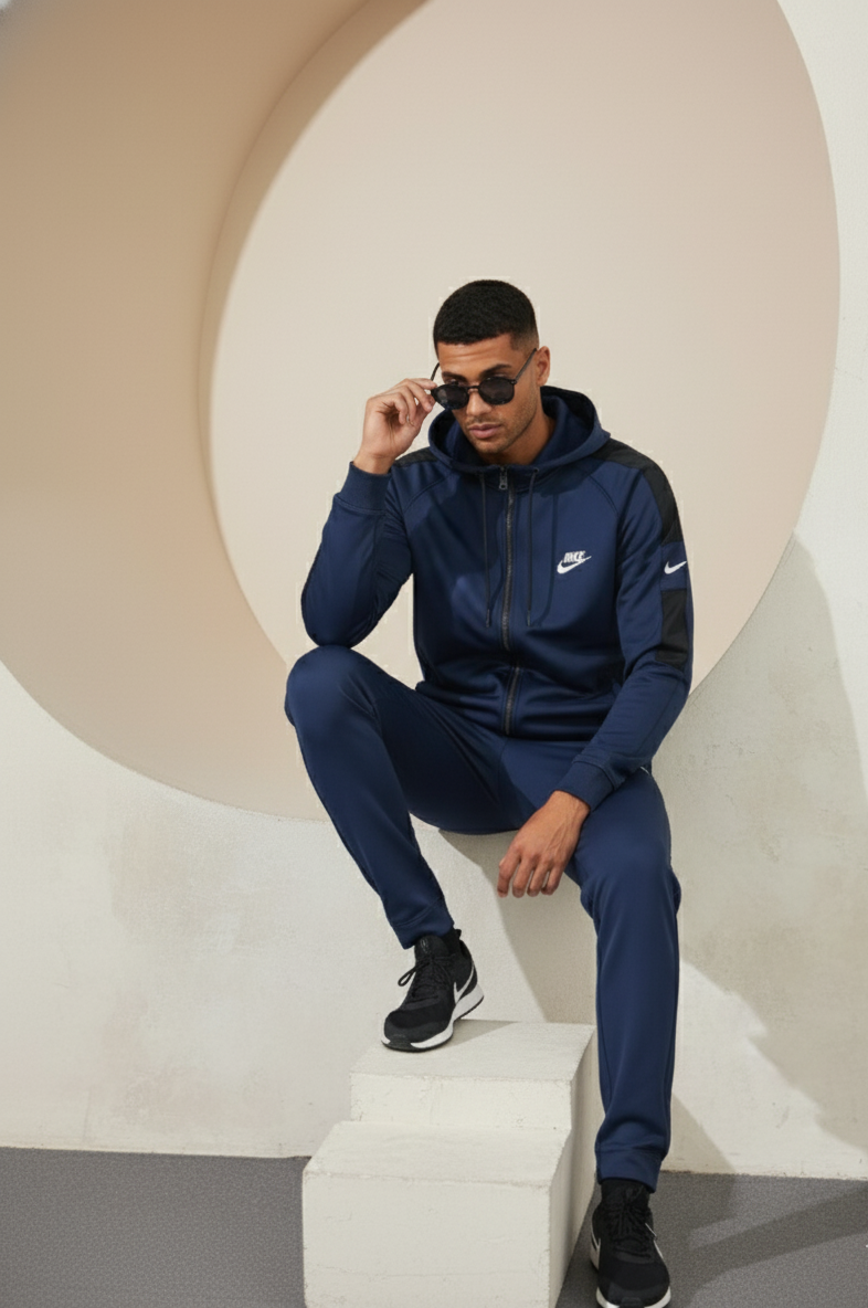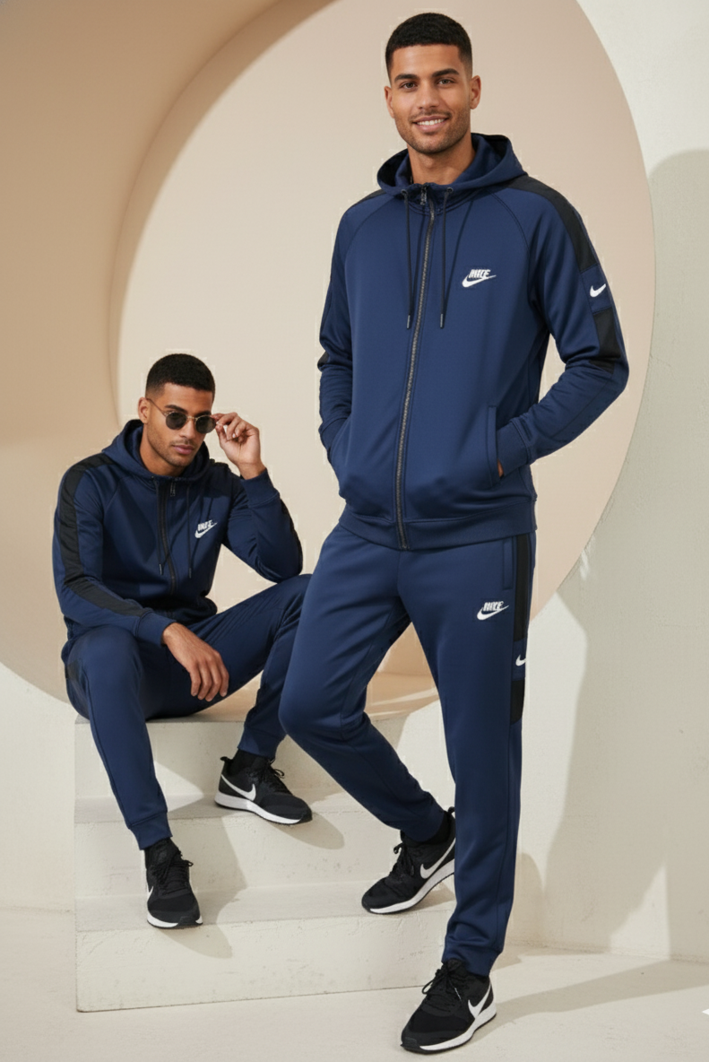 The Nike Interlock Polyester Fleece Tracksuit Navy is built for men who want athletic performance, modern style, and cold-weather comfort in one premium set. Designed in a deep navy blue shade with sleek black shoulder and leg panels, this two-piece tracksuit blends bold contrast with minimalist sportswear aesthetics. Made from high-quality interlock polyester fleece, the fabric features a smooth exterior and a warm, brushed interior—creating a perfect balance of structure, durability, and comfort.