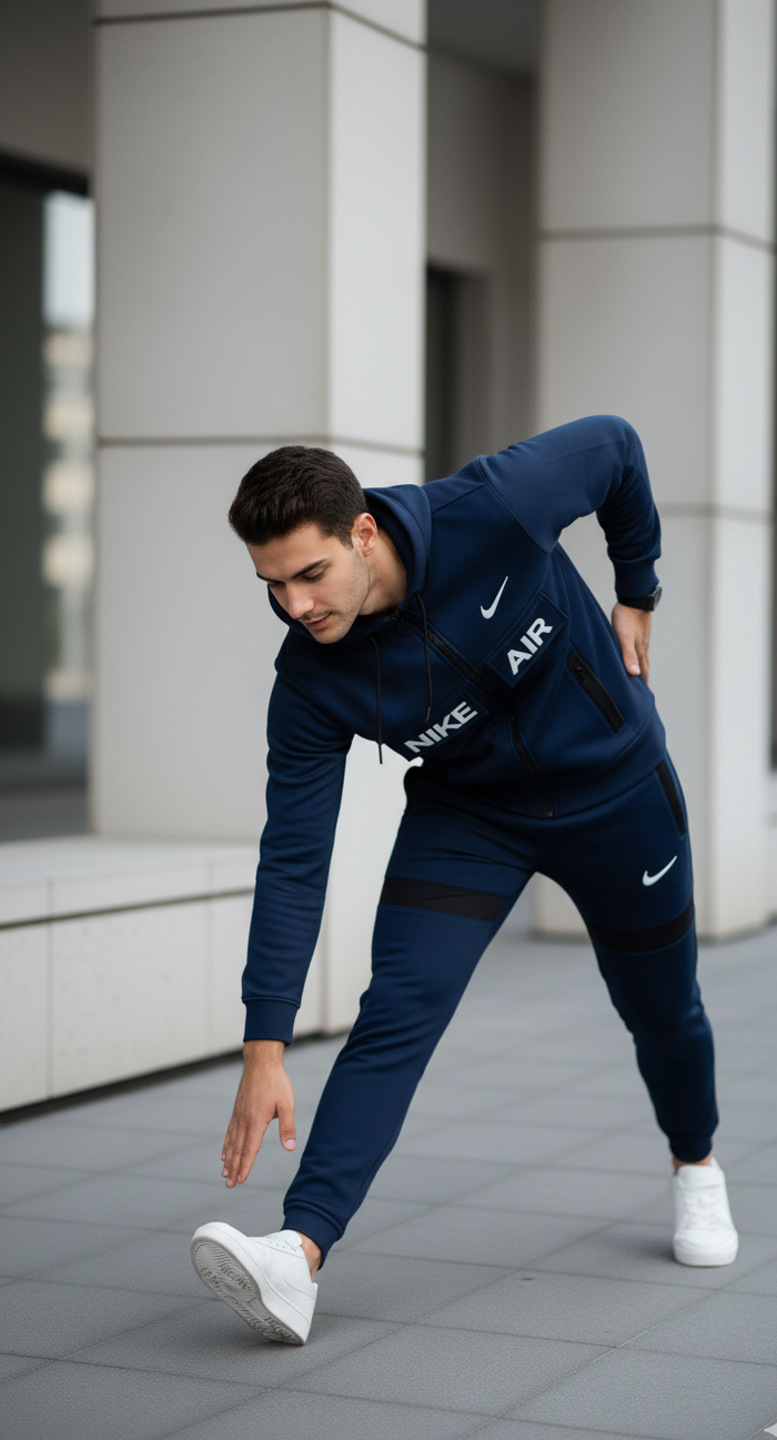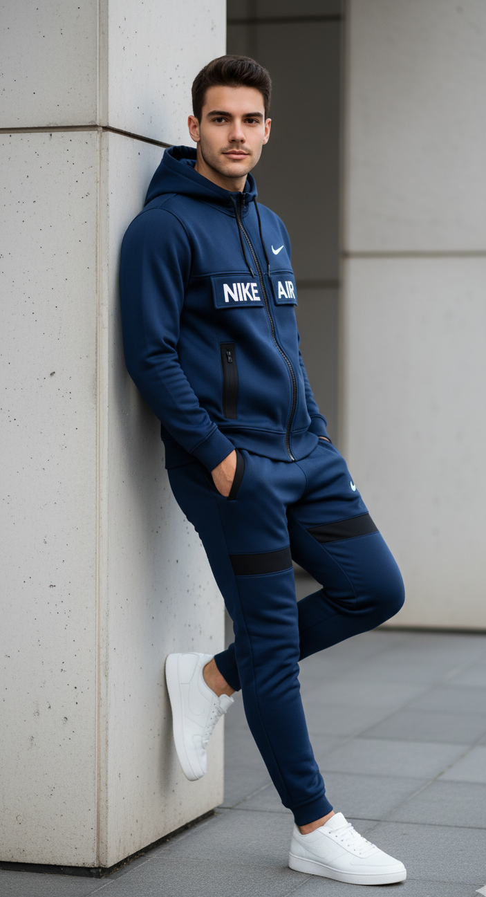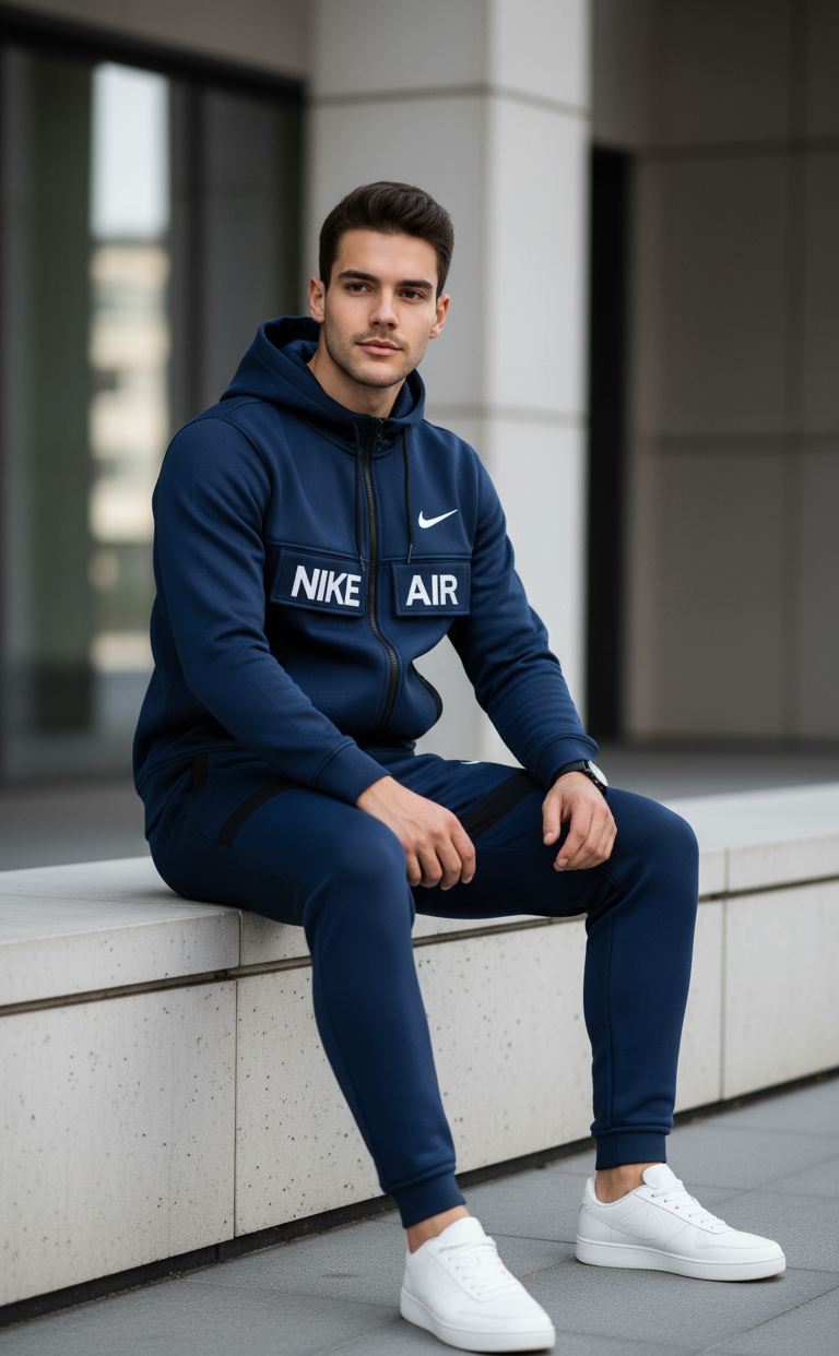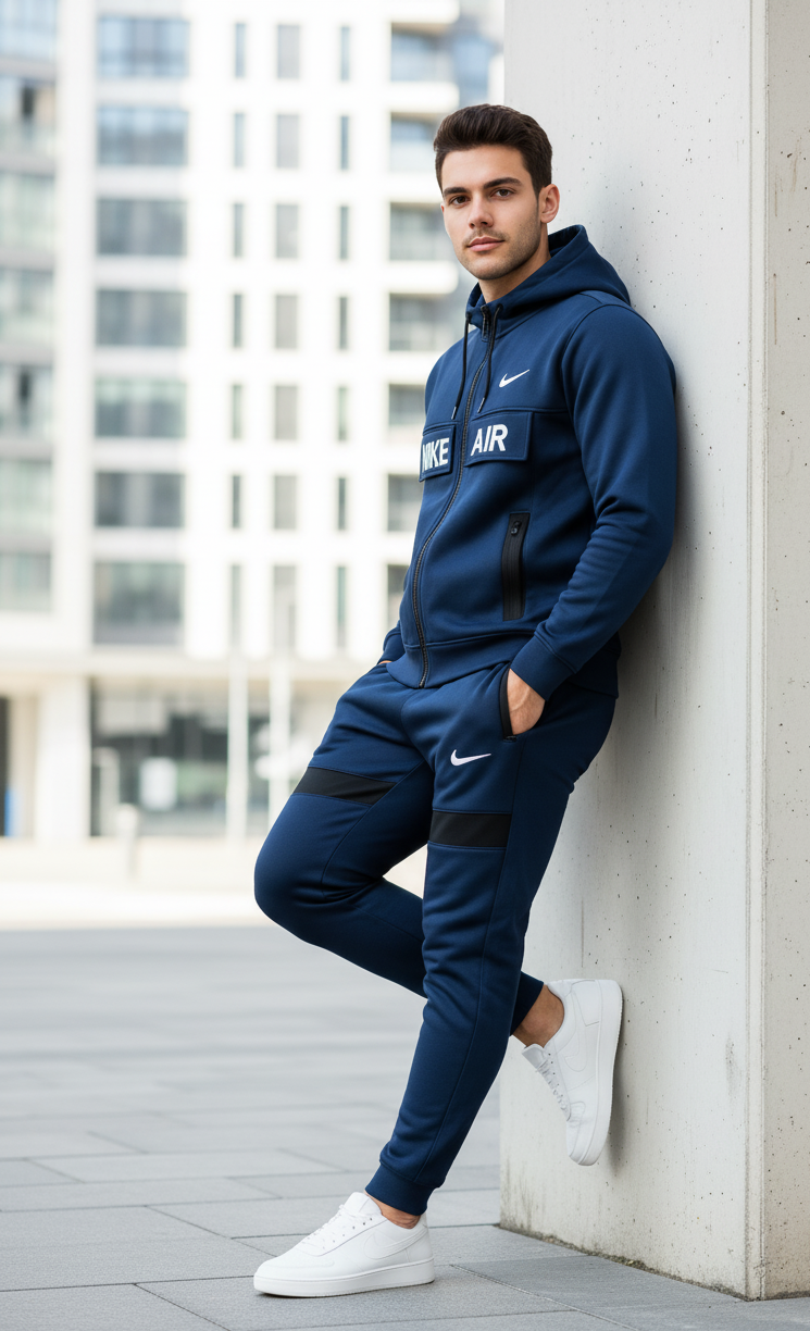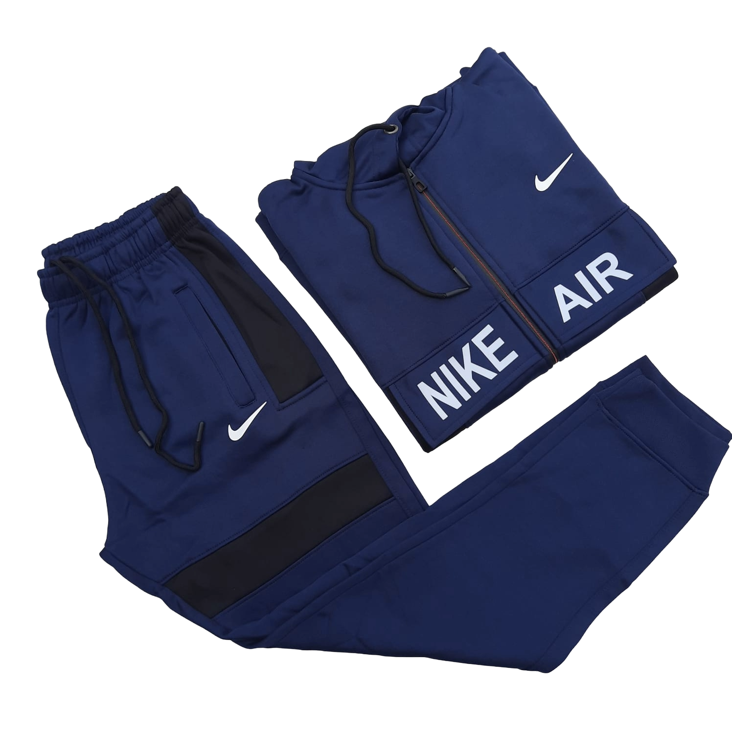 Dominate your casual style with the PREM CHINA ZIPPER AIR TRACKSUIT NIKE. This set is the perfect choice for comfort, warmth, and iconic athletic fashion. It is built for the winter season, and therefore offers a heavyweight feel with strong performance. The tracksuit blends function with a clean, modern streetwear look. The rich navy blue base includes subtle tonal paneling and crisp white branding, which creates a bold and premium appearance. As a result, you get a tracksuit that works well for both daily wear and training. With a full-zip hoodie and matching joggers, the set provides a relaxed athletic fit, durable construction, and signature Nike styling.