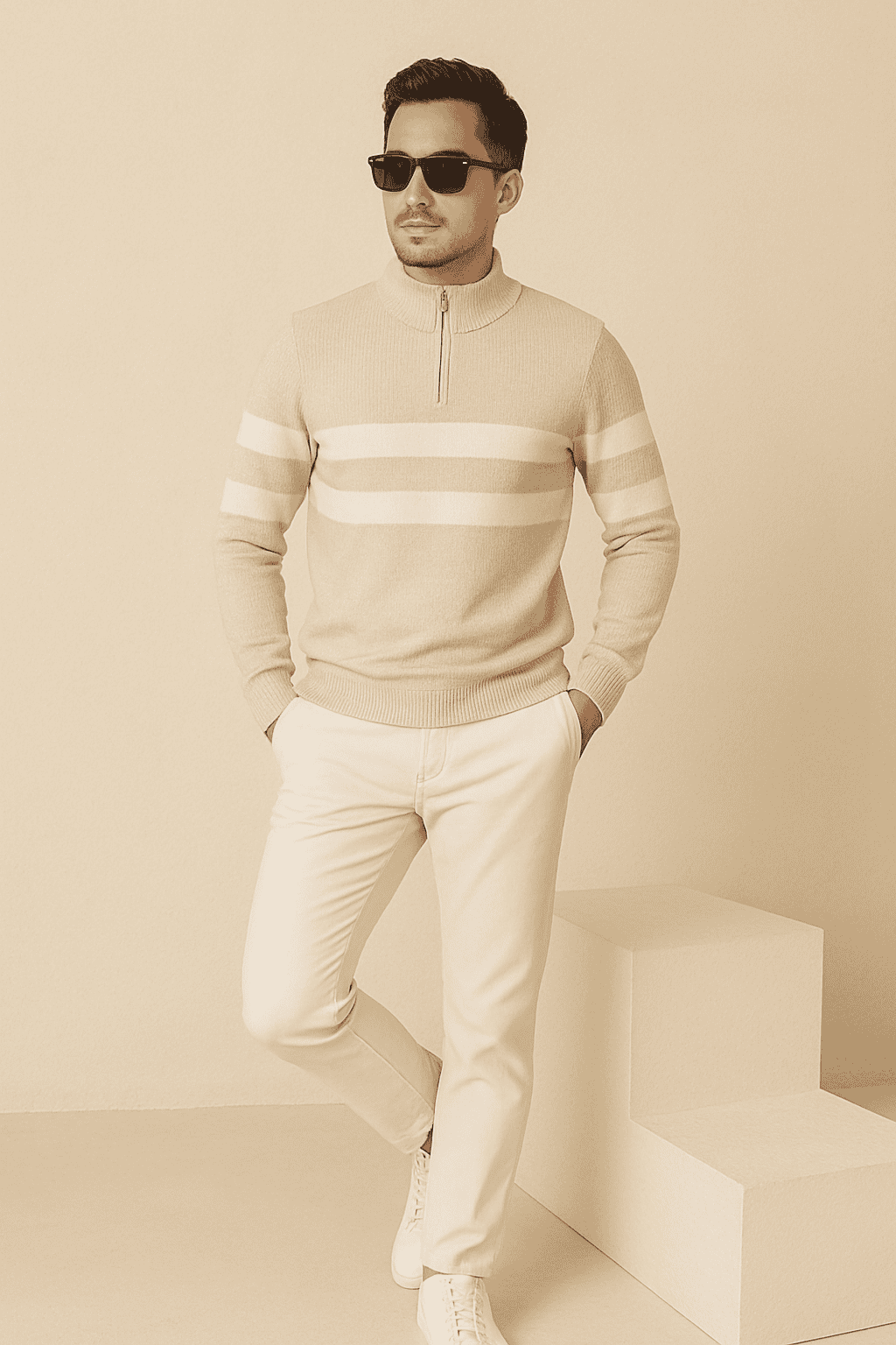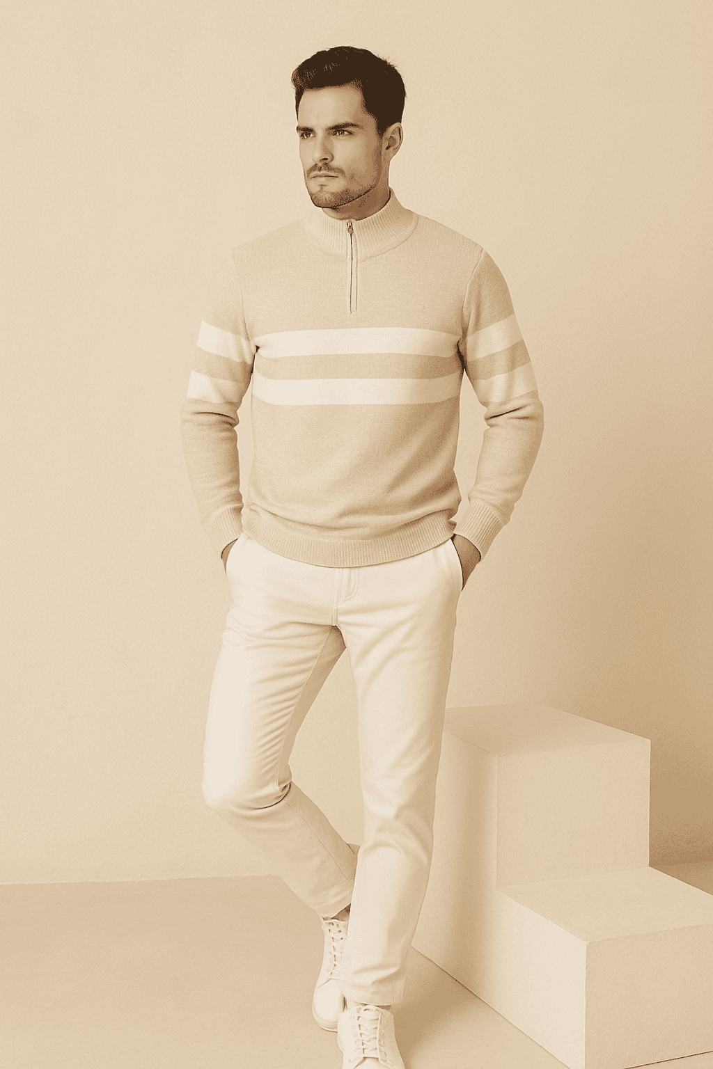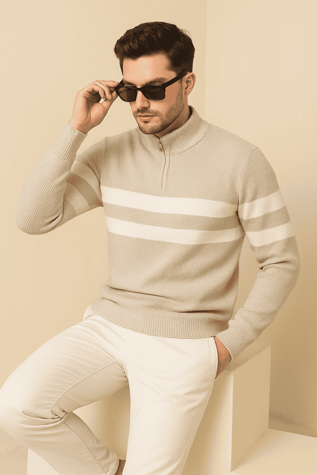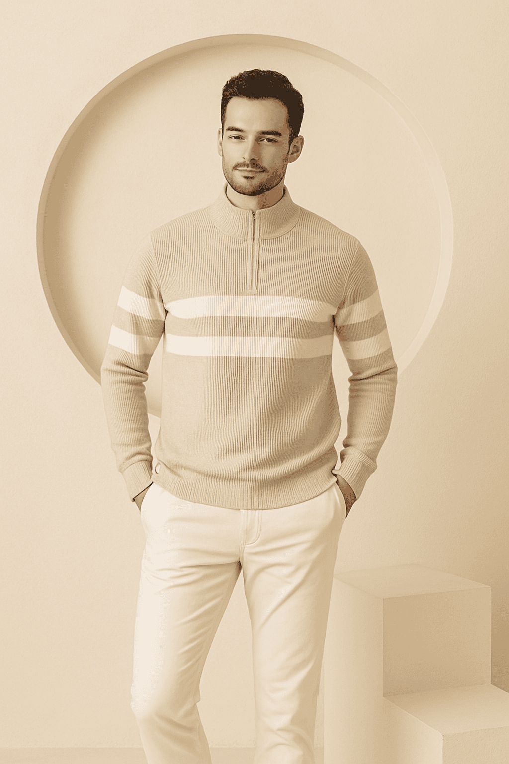 - Style: Half-zip mock neck sweater with double stripe detailing