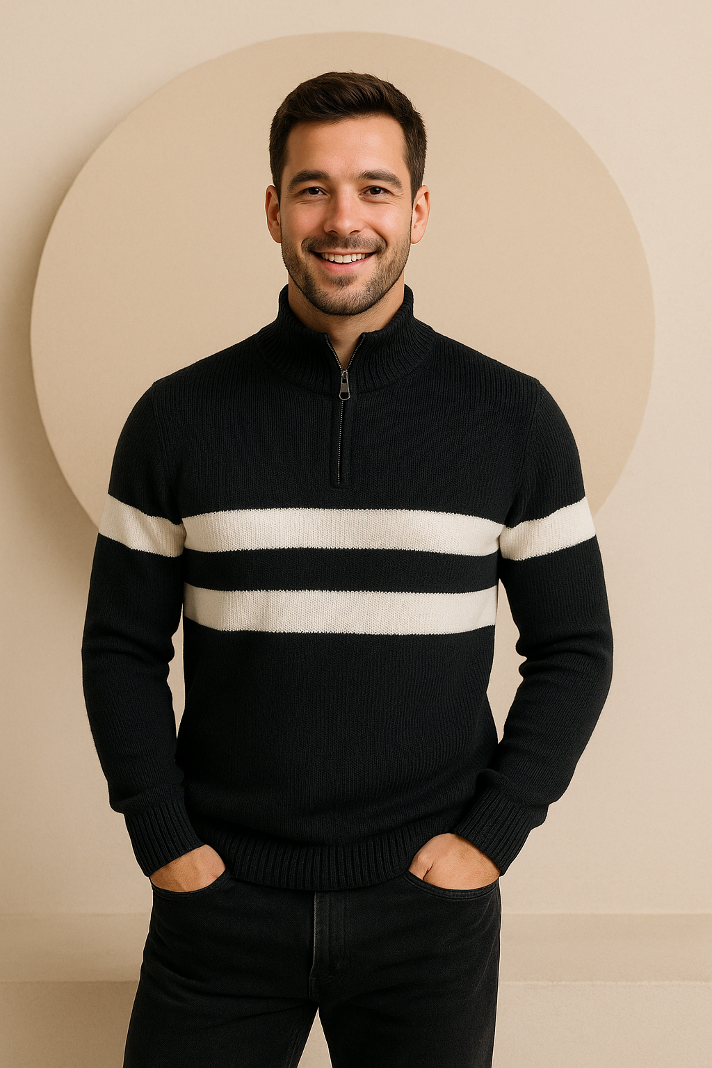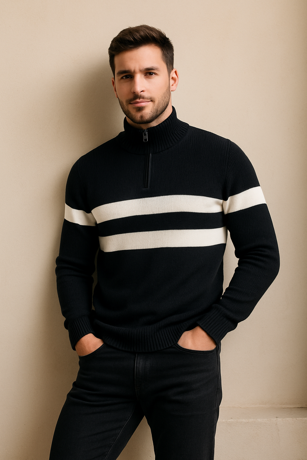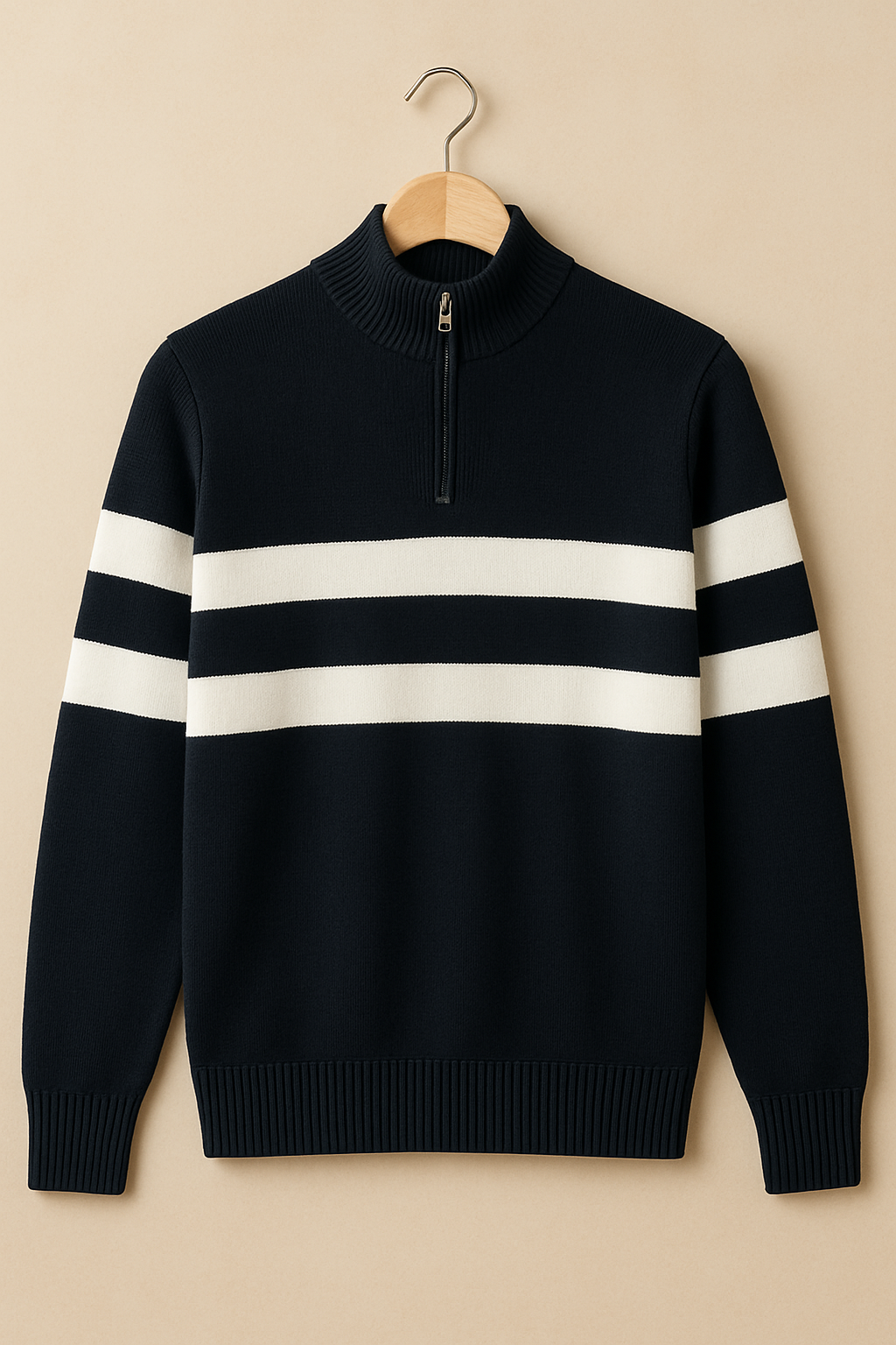 Style: Half-zip mock neck sweater with double-stripe detailing