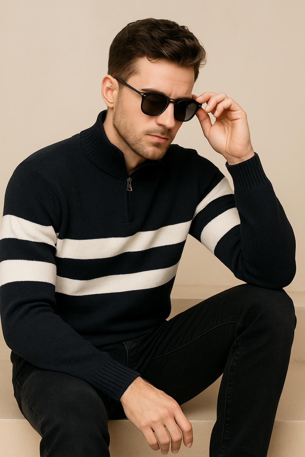 Experience effortless elegance and everyday comfort with the Front 2 Strap Line Rabbit wool Sweater. Crafted from a soft, premium rabbit wool blend, this sweater delivers lightweight warmth with a smooth, cozy feel. Its clean, minimal design is elevated by a refined black body paired with two crisp off-white stripes running across the chest and sleeves, adding a bold yet timeless contrast.