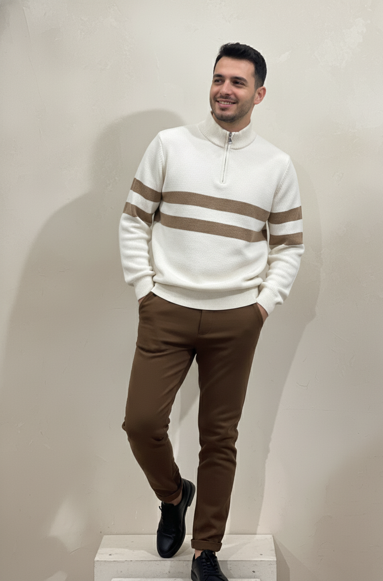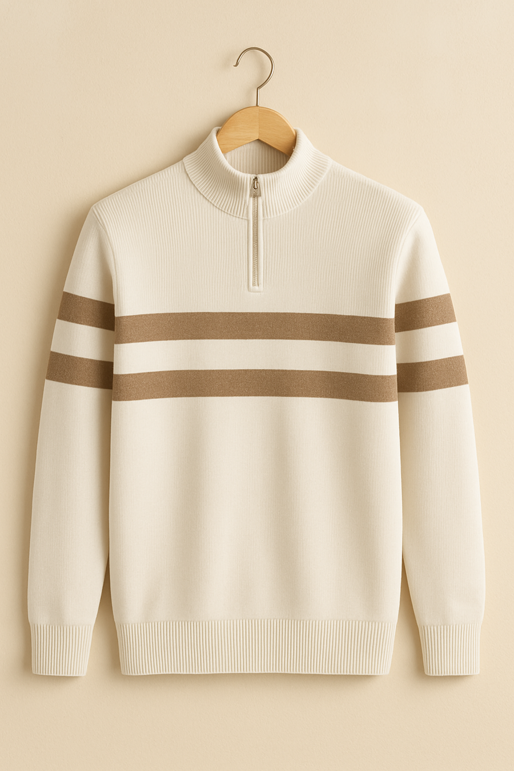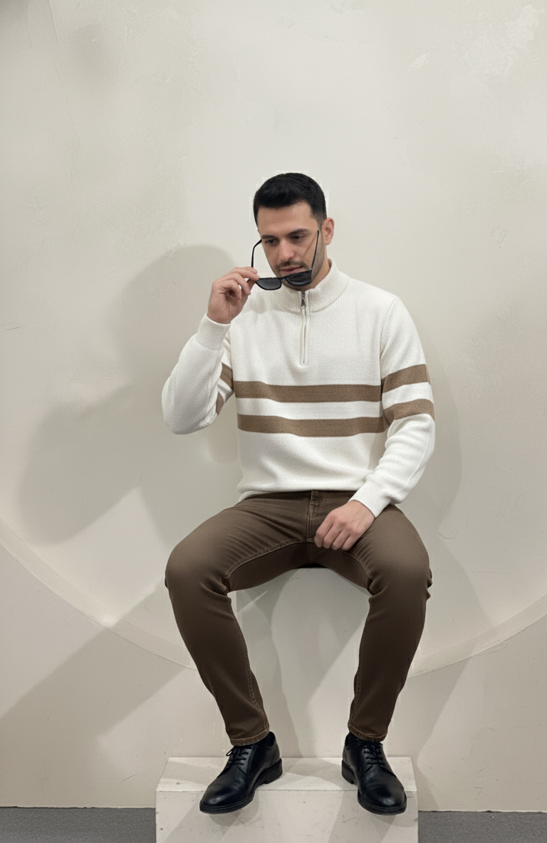 Experience effortless elegance and everyday comfort with the Front 2 Strap Line Rabbitwool Sweater. Crafted from a soft, premium rabbitwool blend, this sweater delivers lightweight warmth with a smooth, cozy feel. Its clean, minimal design is elevated by a refined cream body paired with two crisp camel brown stripes running across the chest and sleeves, creating a subtle yet standout look.