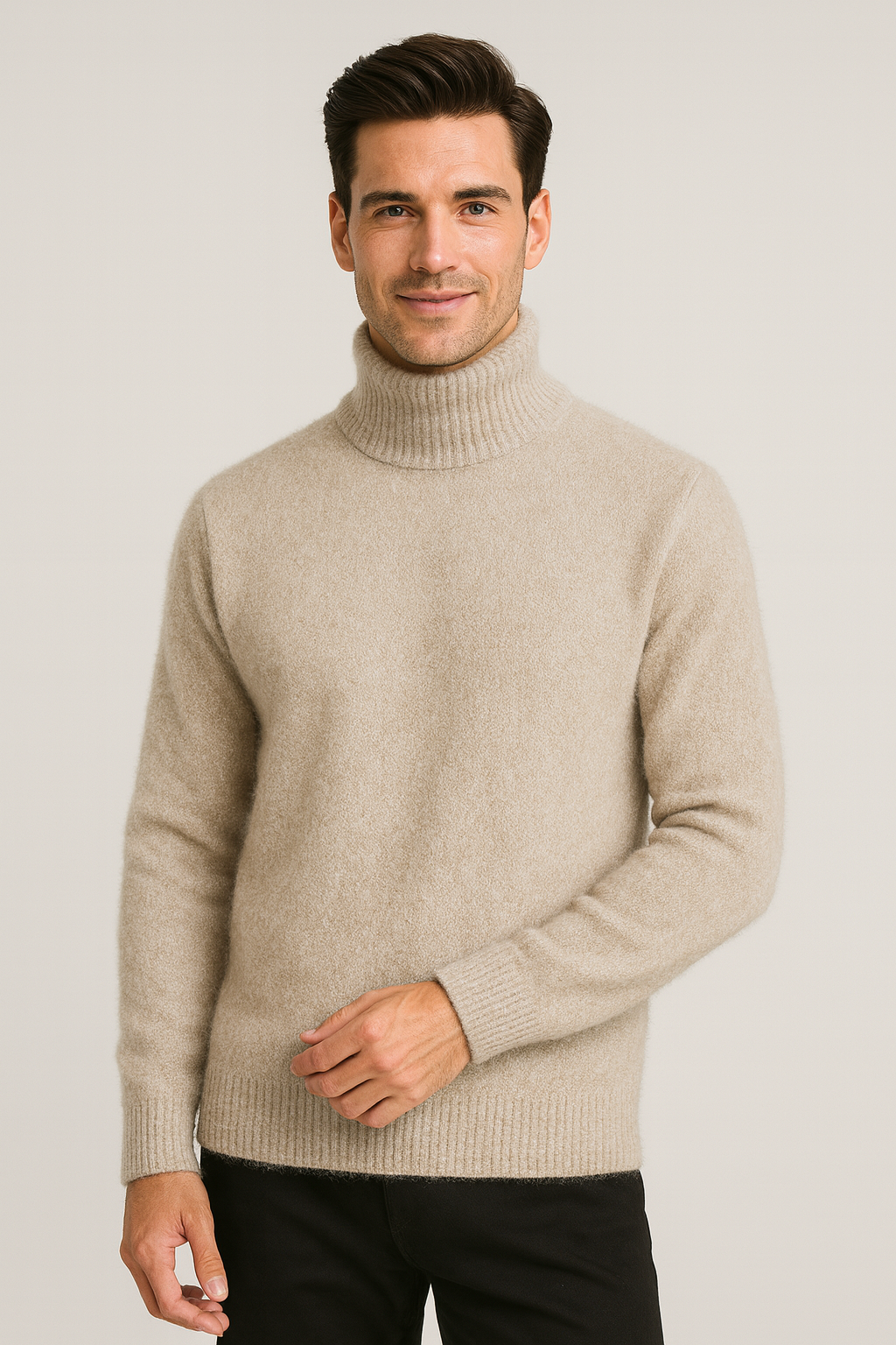 Step into the season with distinctive style and unparalleled warmth in the Moke Neck Rabbit Wool Sweatshirt. This premium knitwear piece redefines cozy elegance, distinguished by its high, sophisticated turtleneck (or mock neck) collar and a rich, solid light beige color.