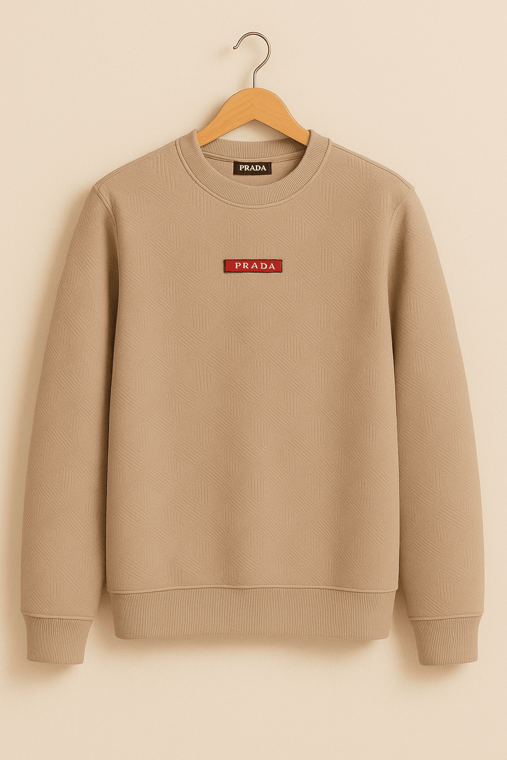 The Prada Garsi Sweatshirt Beige blends luxury minimalism, premium craftsmanship, and modern comfort into a single wardrobe essential. Made from high-quality Garsi textured fabric, this sweatshirt delivers a smooth yet structured feel with a subtle embossed geometric pattern that sets it apart from standard fleece or cotton sweatshirts. The refined beige color enhances the overall elegance, making this piece versatile enough for both casual and upscale styling.