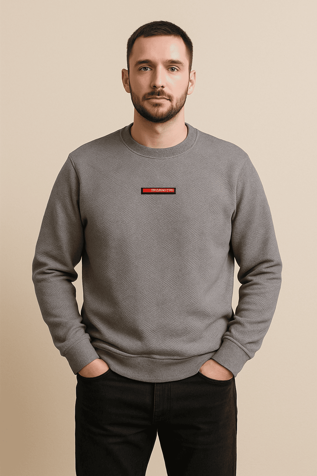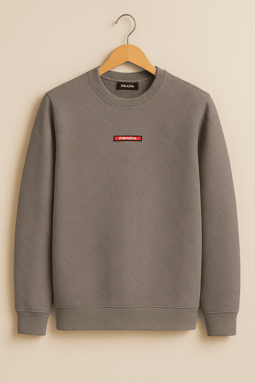 The geometric embossing adds a premium look, while the ribbed neck, cuffs, and hem ensure long-lasting structure. The red Prada-inspired logo patch offers a luxury touch without overpowering the minimalist aesthetic.